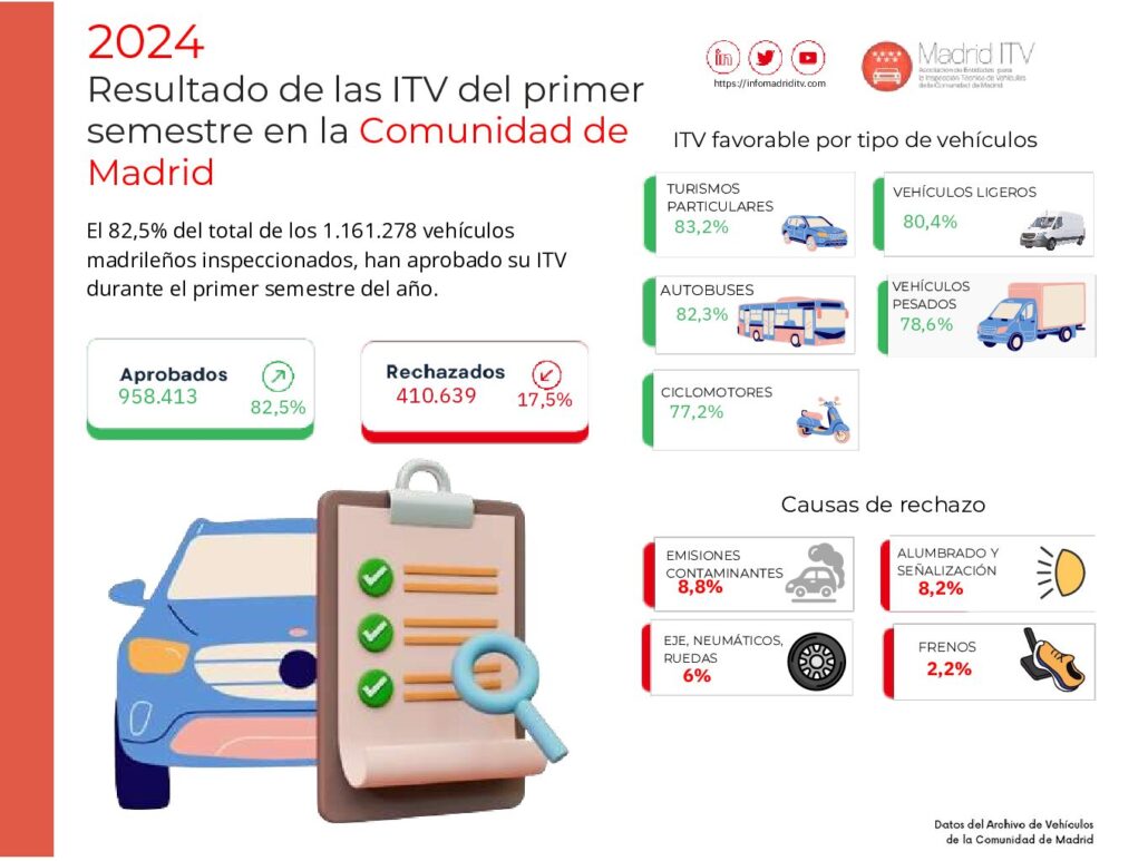 Las estaciones de ITV madrileñas han inspeccionado un total de 1.161.278 vehículos durante el primer semestre del año, así lo indican los datos facilitados por el Archivo de Vehículos de la Comunidad de Madrid a AEMA-ITV, la Asociación de Entidades para la Inspección Técnica de Vehículos de la Comunidad de Madrid. De ellos, 958.413, es decir, el 82,5% ha superado la ITV de manera favorable durante la primera inspección; una cifra que aumenta hasta el 94% en las segundas inspecciones.