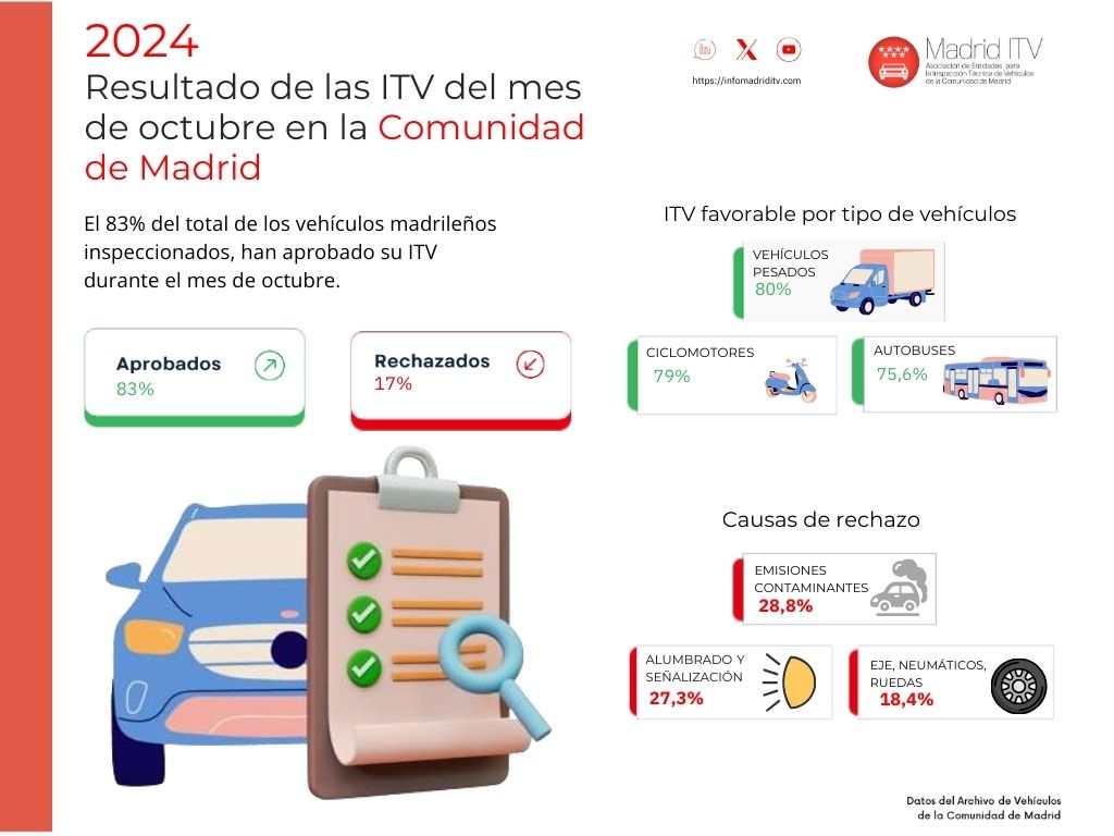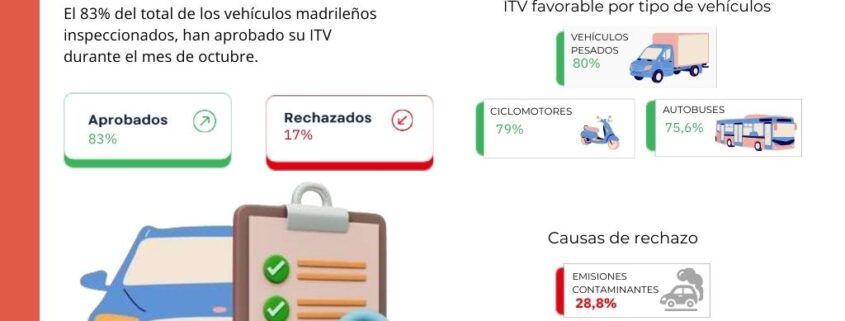 De acuerdo con los datos facilitados por la Asociación de Entidades para la Inspección Técnica de Vehículos de la Comunidad de Madrid, el 83% de los vehículos inspeccionados en octubre en las estaciones de ITV de Madrid aprobaron la inspección técnica a la primera.