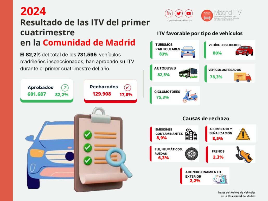 Durante el primer cuatrimestre del año, un total de 731.595 vehículos se han sometido a la inspección técnica en la Comunidad de Madrid y un 82,2% la ha superado, según los datos facilitados por el Archivo de Vehículos de la Comunidad de Madrid a AEMA-ITV, la Asociación de Entidades para la Inspección Técnica de Vehículos de la Comunidad de Madrid.