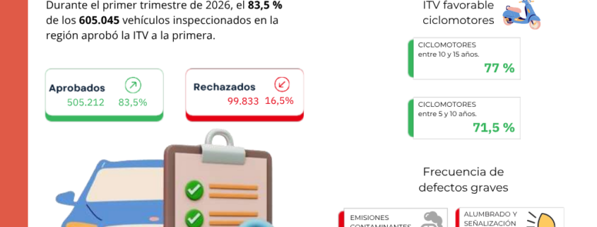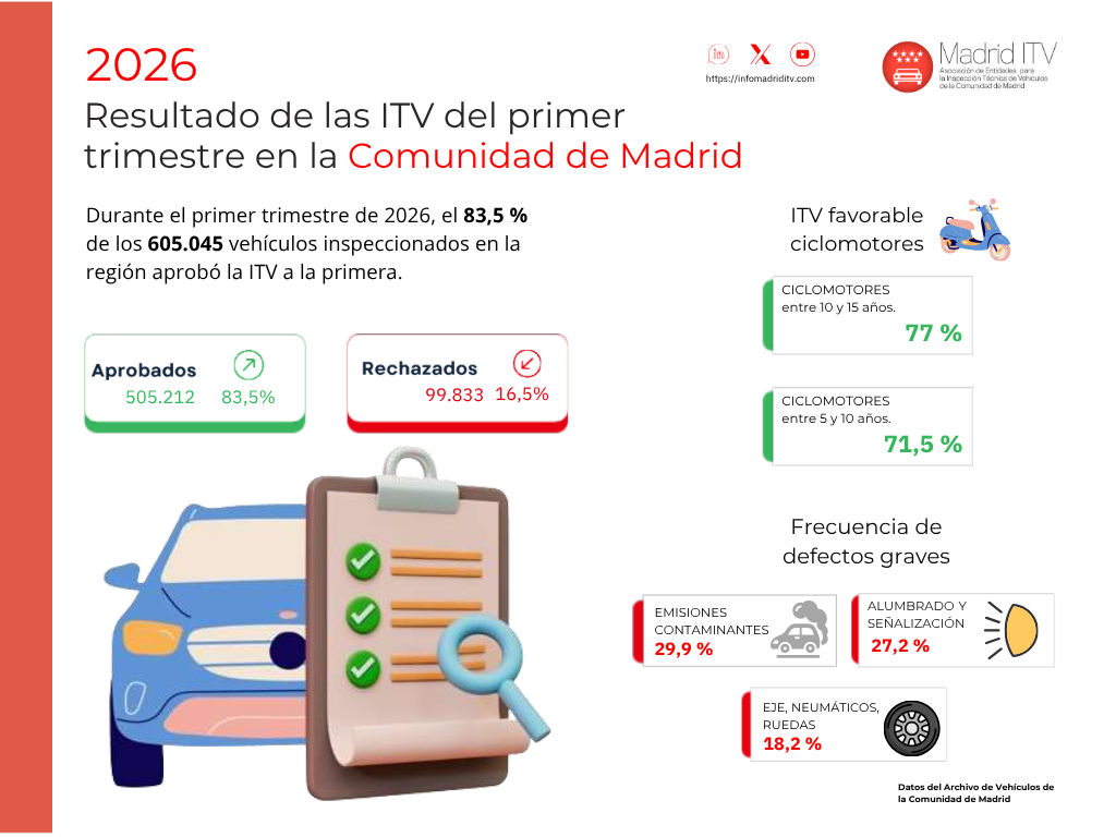 >> De acuerdo con datos del Archivo de Vehículos de la Comunidad de Madrid, el 83,5% de los vehículos madrileños inspeccionados entre enero y marzo de 2026 ha aprobado la ITV